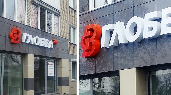 Главным требованием заказчика было то, чтобы буквы крепились прямо на плитке без металлических направляющих. Нами была применена впервые в г.Гомеле система крепления объемных букв на вентилируемом фасаде без металлического основания. Буквы и логотип изготовлены по новой технологии, позволяющей сделать с градиентной заливкой.
